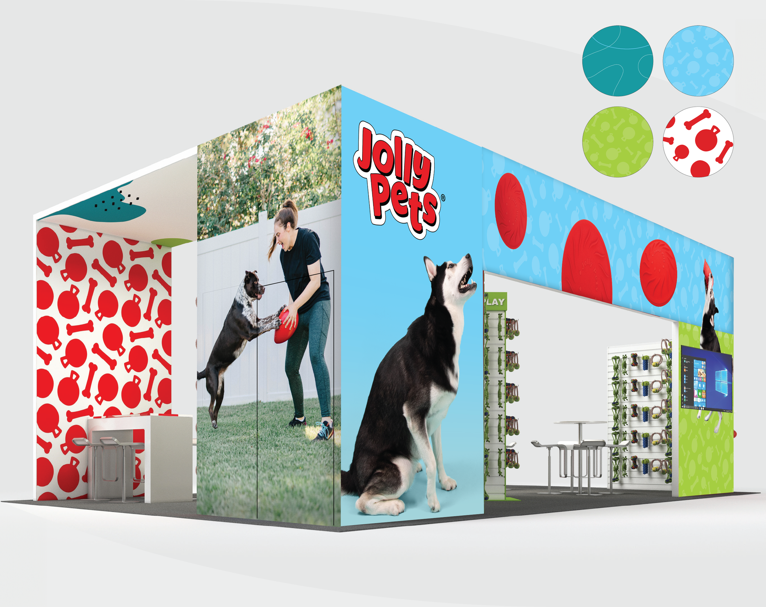As the lead designer for Jolly Pets’ and Barker Beds’ national pet industry tradeshow presence, I created comprehensive booth experiences for Global Pet Expo and SuperZoo that brought their brand visions to life on a large scale. The displays featured the flagship Jolly Pets brand alongside their sister brand Barker Beds, and our collaboration with Link My Pet's innovative smart wearable GPS technology. I designed every visual element of the booth, including eye-catching display panels, branded kiosk toppers, freestanding kiosks, and all integrated graphics that unified the three brands into a cohesive, engaging retail environment.